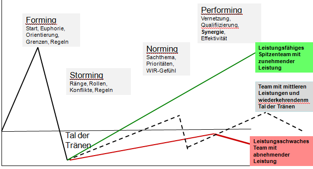 In der Zusammenarbeit von Teams in Projekten entstehen jedoch nach Tuckmann regelmäßig typische Teamdynamiken wie z.B. Stormingphasen, die ohne eine sinnvolle Zusammensetzung des Teams, Unterstützung im Verlauf der Teambuildung-Phase und Intervention in Konfliktfällen einen destruktiven Charakter einnehmen. Dies wird u.a. vermieden durch eine zielorientierte Teambesetzung, die Entwicklung eines gemeinsamen Zielverständnisses, einer einheitlichen Vision der Zusammenarbeit und entsprechenden Teambuildingsmaßnahmen, Maßnahmen zur Konfliktvermeidung und -lösung. (vgl. Bruce W. Tuckman, Mary Ann Jensen: Stages of small-group development revisited. In: Group and Organization Studies. 2, 4, Dez 1977, S. 419 bis 427. vgl. auch Bruce W. Tuckman: Developmental sequence in small groups. In: Psychological Bulletin. 63, 1965, S. 384 bis 399.)