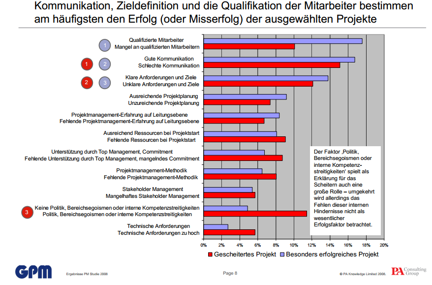 Ergebnisse der Projektmanagement Studie 2008 " Erfolg und Scheitern im Projektmanagement " Gemeinsame Studie der GPM Deutsche Gesellschaft für Projektmanagement e.V. und PA Consulting Group Claus Engel, Alexander Tamdjidi, Nils Quadejacob, Dezember 2008, S. 8.